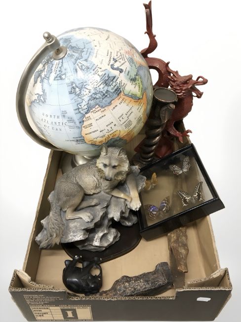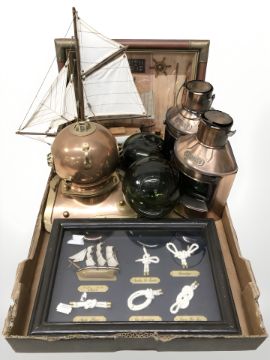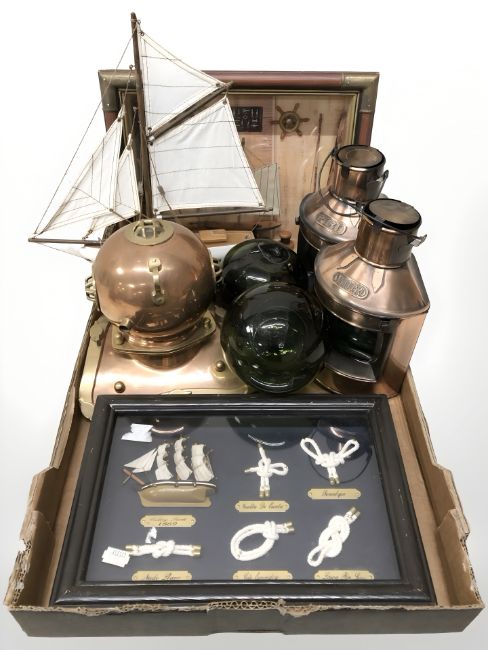 A miniature copper and brass diver's helmet, pair of reproduction ships lamps, glass floats, knot montage, model ship, together with a globe, framed butterfly specimens, ornaments, etc. (2 boxes)