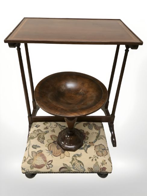 An Edwardian inlaid mahogany occasional table, a low footstool and a Chapman's Siesta turned bowl