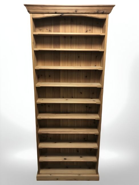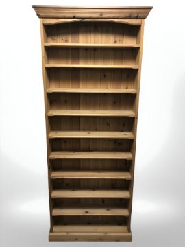 A modern pine open bookcase, 85 cm W x 22 cm D x 204 cm H.