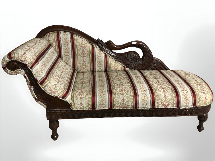 A reproduction miniature mahogany chaise longue, with swan back rest, length 93 cm.