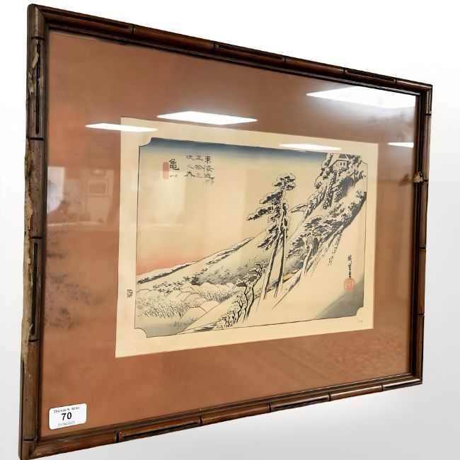 After Hiroshige : Clear Weather after Snow at Kameyama, hand coloured print, 38 cm x 26 cm.