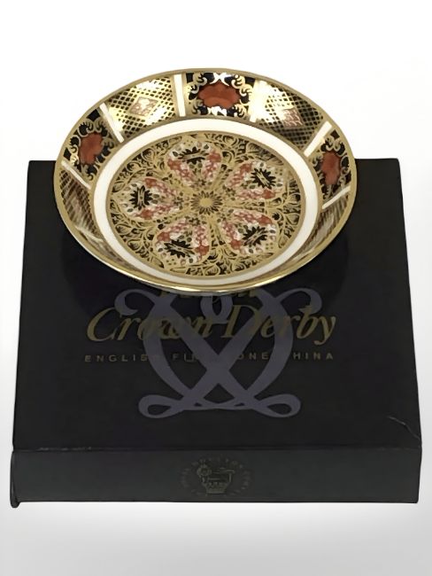 A Royal Crown Derby Old Imari shallow circular dish, diameter 11 cm, boxed.