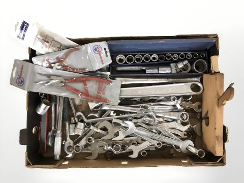 A quantity of spanners, pliers, socket set and hand tools (one box)