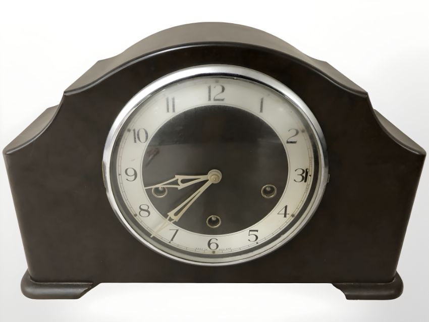 An Art Deco Bakelite eight day chiming mantel clock, width 37 cm.