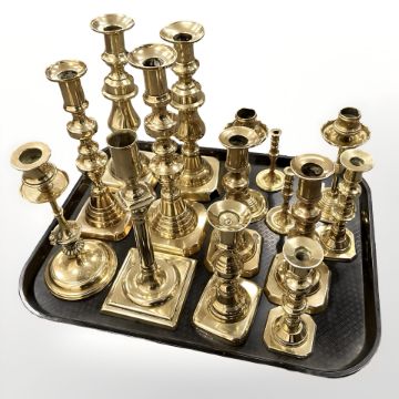 A quantity of brass candlesticks, antique and later examples, including some pairs.