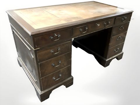 A reproduction nine drawer writing desk, 138 cm wide x 76 cm x 76 cm