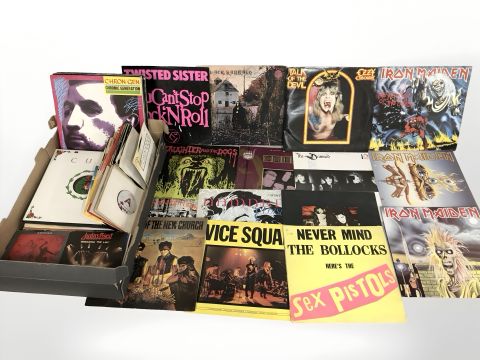 Vinyl LP records and singles including Iron Maiden, Ozzy Osborne, Judas Priest, The Cult, Billy Idol, Van Halen, Motley Crew, Twisted Sister, AC/DC, Black Sabbath etc (one box)