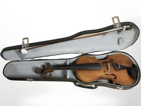 A 20th century violin, labelled within 'Antonius Stradivarius, Cremonensis, Anno 1713, made in Czechoslovakia', with two piece 14" back, in case with bow.