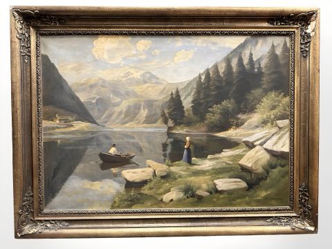 Danish School : Figures by a fjord, oil on canvas, 100 cm x 70 cm.