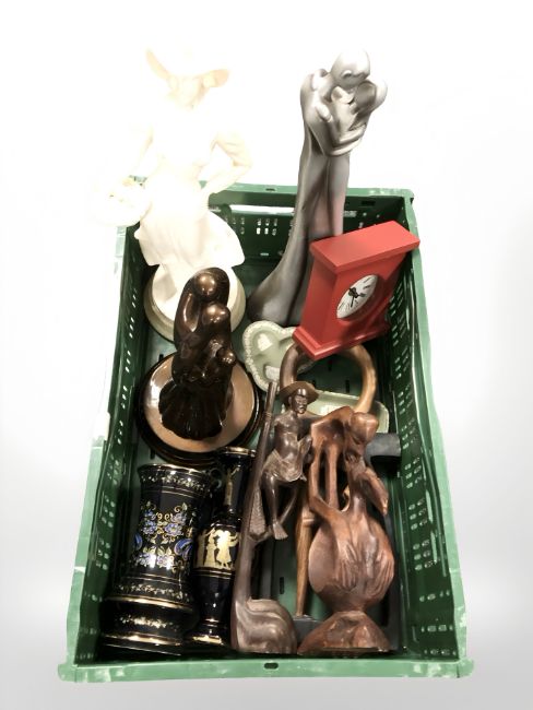 Assorted figures, a quartz mantel clock, Wedgwood Jasperware and other ceramics. (1 box)