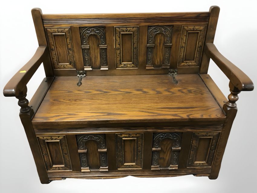 A reproduction oak storage settle, 98 cm W x 50 cm D x 85 cm H.