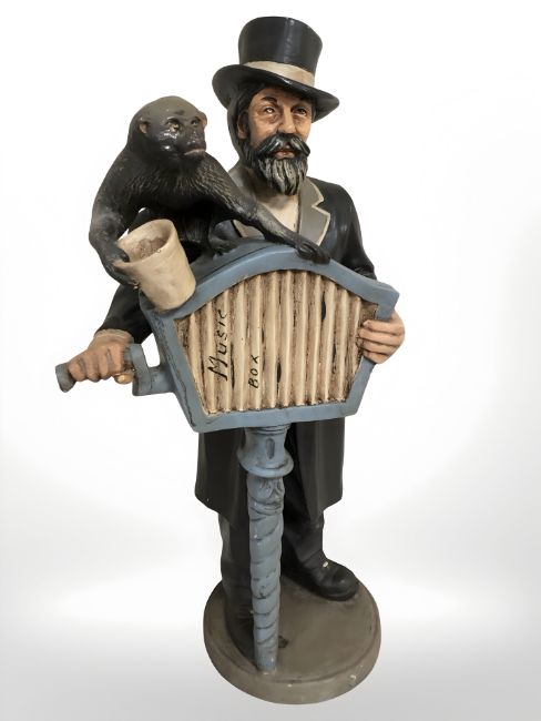 A painted composition figure of a street performer with music box and monkey, height 62 cm.