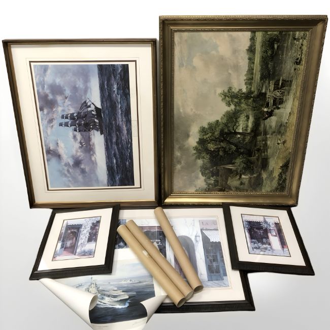 After John Constable : The Hay Wain, colour print, 69 cm x 98 cm, together with a further group of pictures and prints including Montague Dawson, three bistro prints, etc.