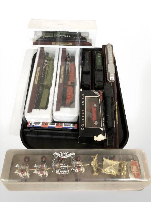 A group of scale model locomotives on plinths, 1977 silver jubilee royal state coach die cast miniature set, a Herpa 1:43 scale die cast car, etc.