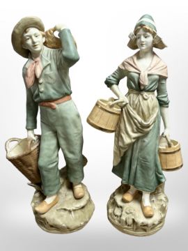 A pair of Bohemian porcelain figures of a lady and gentleman carrying pails and baskets, height 52 cm.