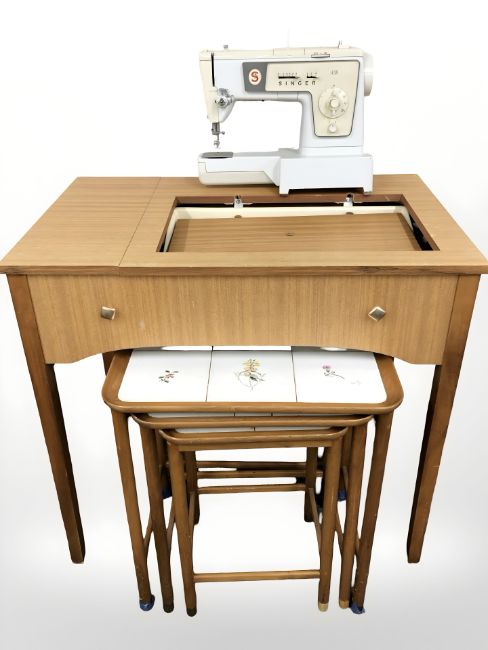 Singer 438 electric sewing machine in table and a nest of three tiled inset tables