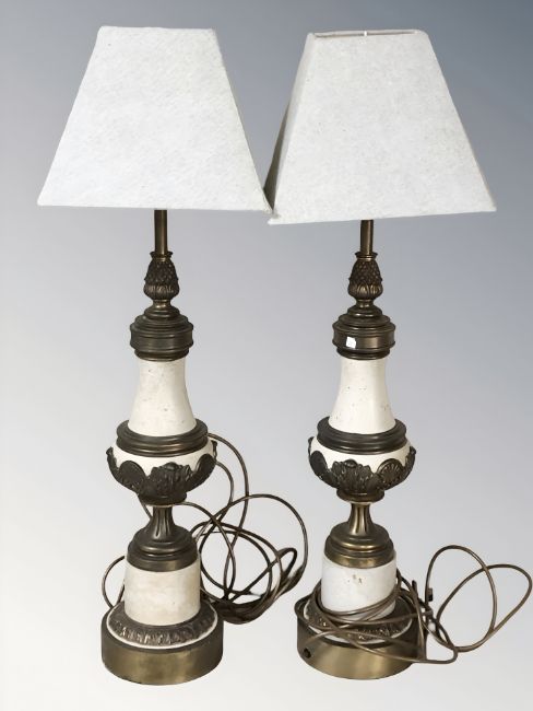 A pair of decorative ceramic and brass mounted table lamps with shades, height 80 cm.