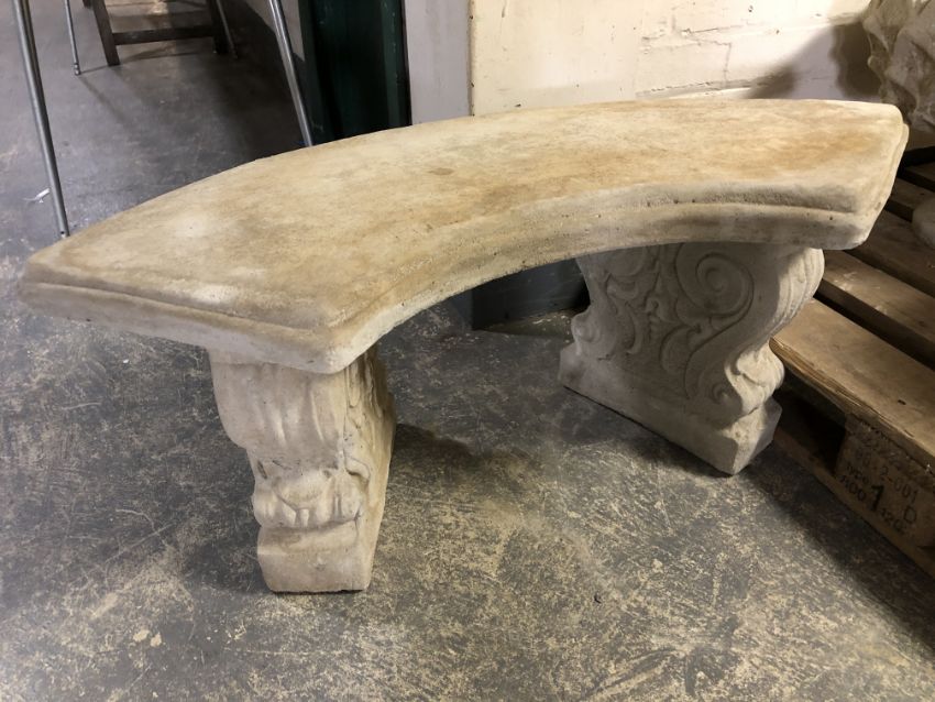 A concrete twin pedestal crescent shaped garden bench, length 102 cm