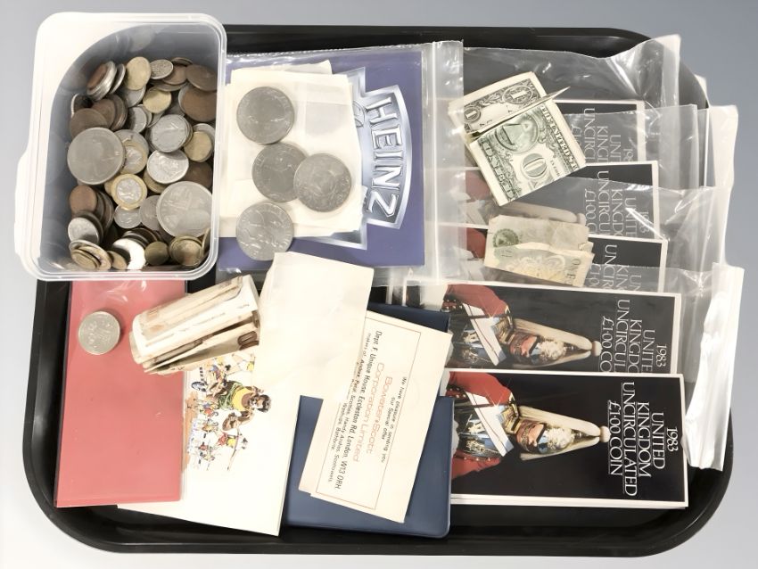 Assorted crowns, uncirculated one pound coins, dollar bills, decimal and pre-decimal pieces.