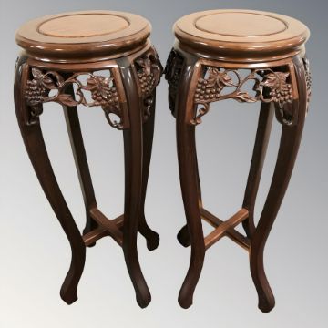 A pair of reproduction carved hardwood Chinese jardiniere stands, height 81 cm.