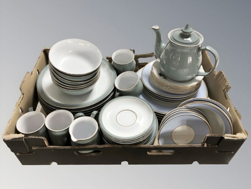 A quantity of Denby pale green glazed stoneware table wares, several Royal Stafford gaiety saucers and a quantity of Royal Doulton blue ground dinner plates. (1 box)