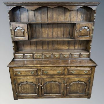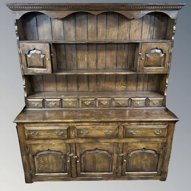 A Titchmarsh & Goodwin reproduction oak dresser, 168 cm W x 44 cm D x 192 cm H.
