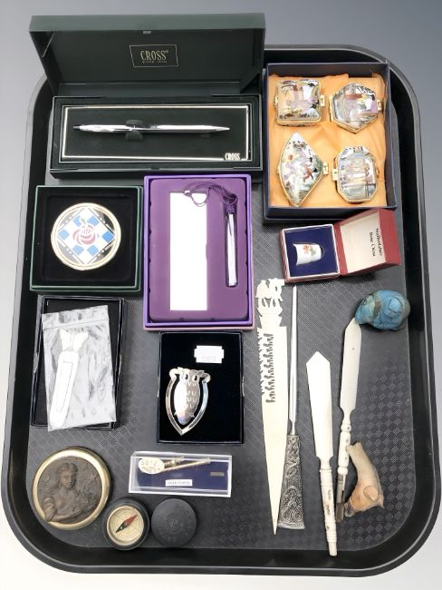 A group of letter openers, bookmarks, set of oriental porcelain pill boxes, paperweight, pocket compass, etc.