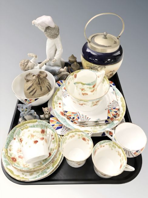 A group of various tea china, biscuit barrel and matching sifters, Nao figure of two children, studio pottery mouse money box, pair of ceramic Tom & Jerry figures, etc.