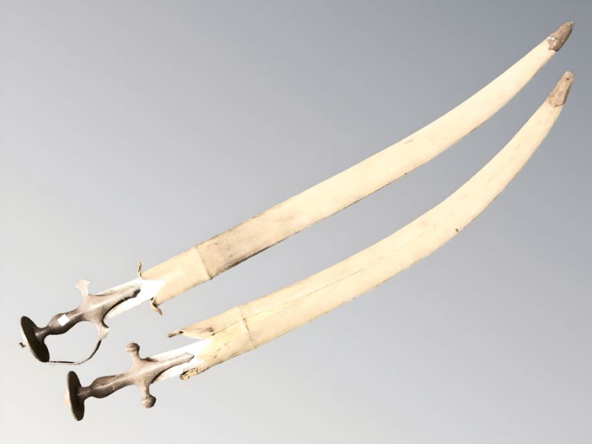 Two Indian Tulwar swords, in sheathes, longest 97 cm overall.