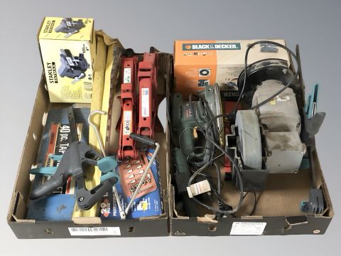 A bench grinder, Bosch sander, other power tools and hand tools, Stanley vice, socket and bit set, etc. (2 boxes)