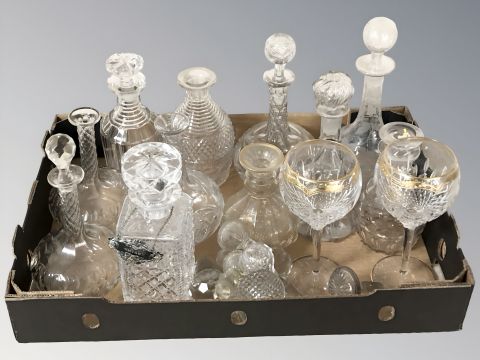 A boxed pair of Stuart wine glasses, two others matching and various crystal decanters, etc. (1 box)