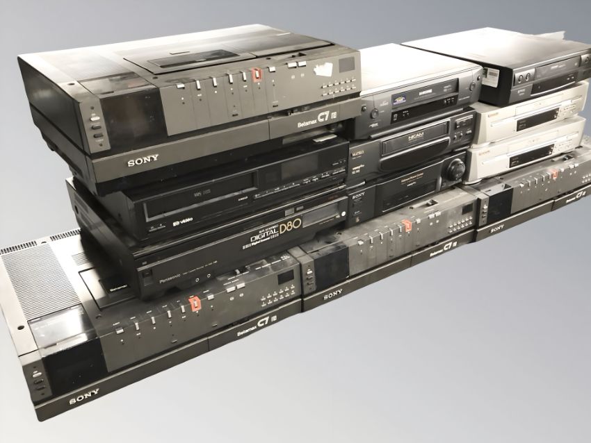 Vintage electricals including four Sony Betamax C7s, Samsung and Panasonic VCRs, Sony video cassette recorder SLV-E25, etc.