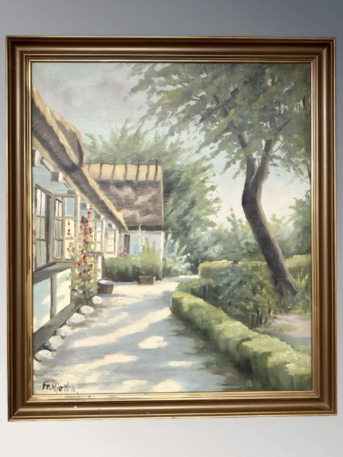 F Hjorth : a thatched cottage garden, oil on canvas, 57 cm x 49 cm