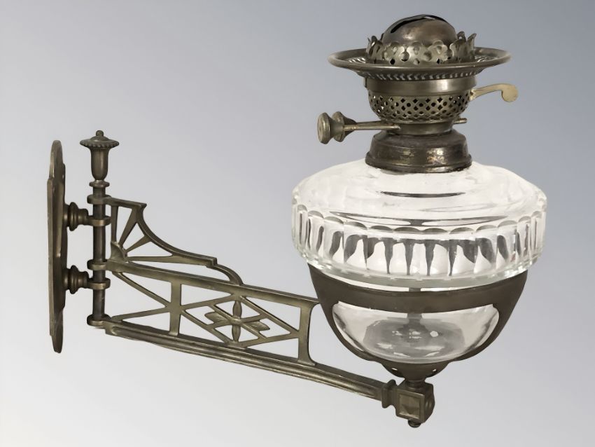 A Victorian oil lamp with brass mounting bracket, length 38 cm.