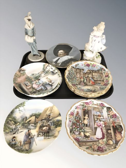 A group of collectors plates including Royal Doulton, Crown Staffordshire, etc, together with Capodimonte figure of a lady and a further porcelain figure of a girl with goose.