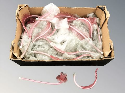 A quantity of cranberry glass epergne branches. (1 box)