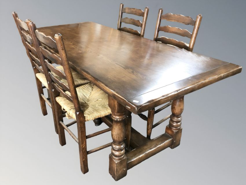 A Titchmarsh & Goodwin reproduction oak refectory dining table, 185 cm x 81 cm x 76 cm, together with a matching set of four oak ladder back dining chairs with rush seats.