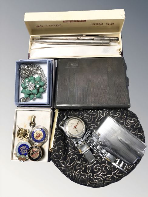 A silver cigarette case with engine turned decoration, Northern Goldsmiths, Birmingham marks, a silver propelling pencil plus another, vintage purse, Ronson lighter, enameled badges, a gent's Oris stainless steel wristwatch, etc.