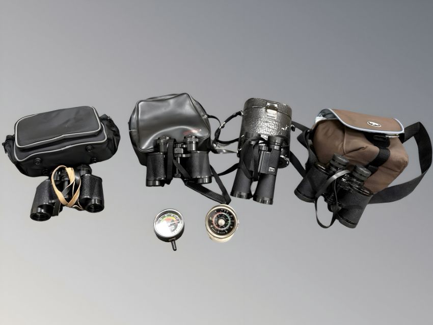 A pair of Nikon 12x36 5° binoculars, Canon 7x35 binoculars, two pairs of USSR 8x30 binoculars, a vintage car brake testing Dynometer and a further Gunson gauge (6)