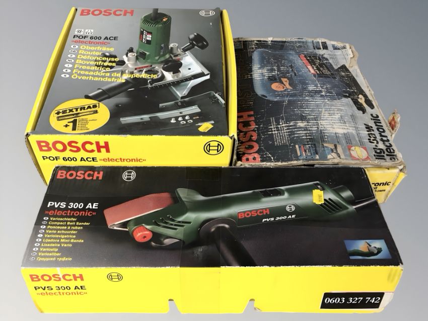Three boxed Bosch power tools to include compact belt sander, router and jigsaw. (1 box)