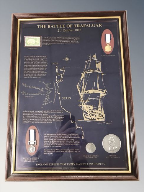 A Battle of Trafalgar framed montage, 46 cm x 34 cm.