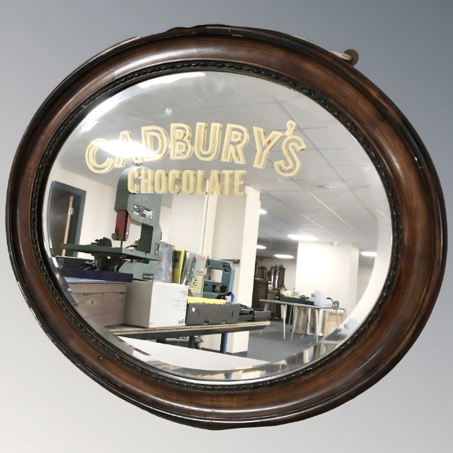 An Edwardian oval wall mirror with later Cadbury's chocolate advertising decoration, width 60 cm.
