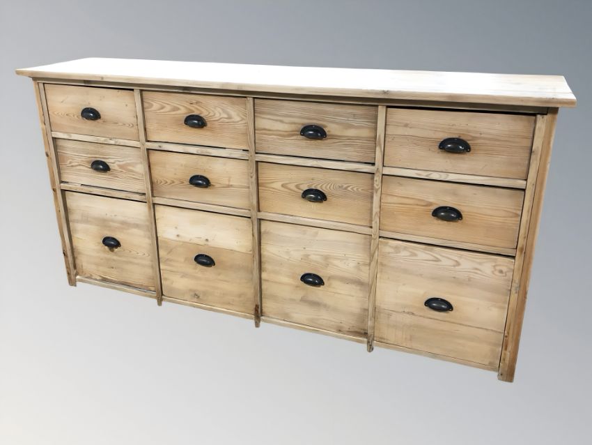 An early 20th century pine twelve drawer sideboard, 202 cm L x 45 cm D x 102 cm H.
