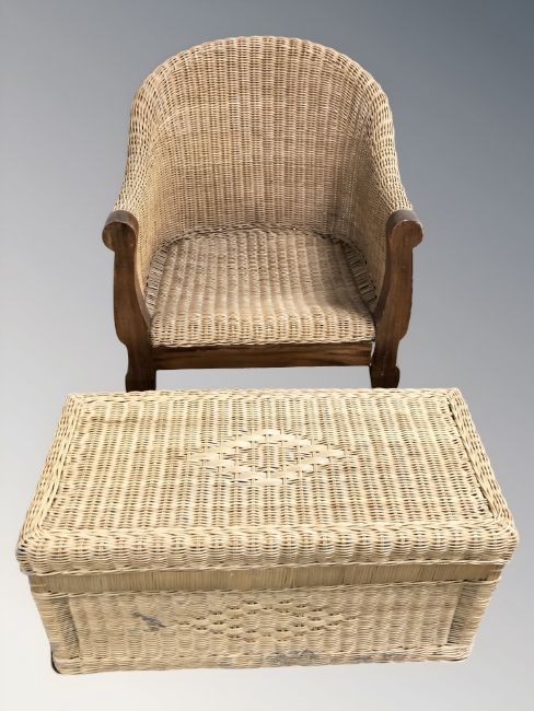 A wooden framed wicker armchair and a wicker hamper.