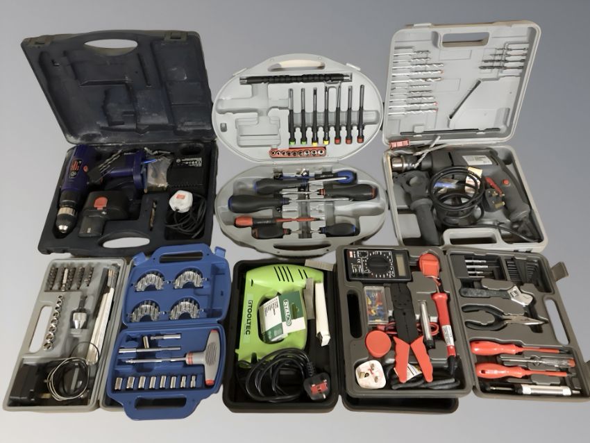 A group of cased tools including drills, screwdriver sets, socket set, etc. (1 box)