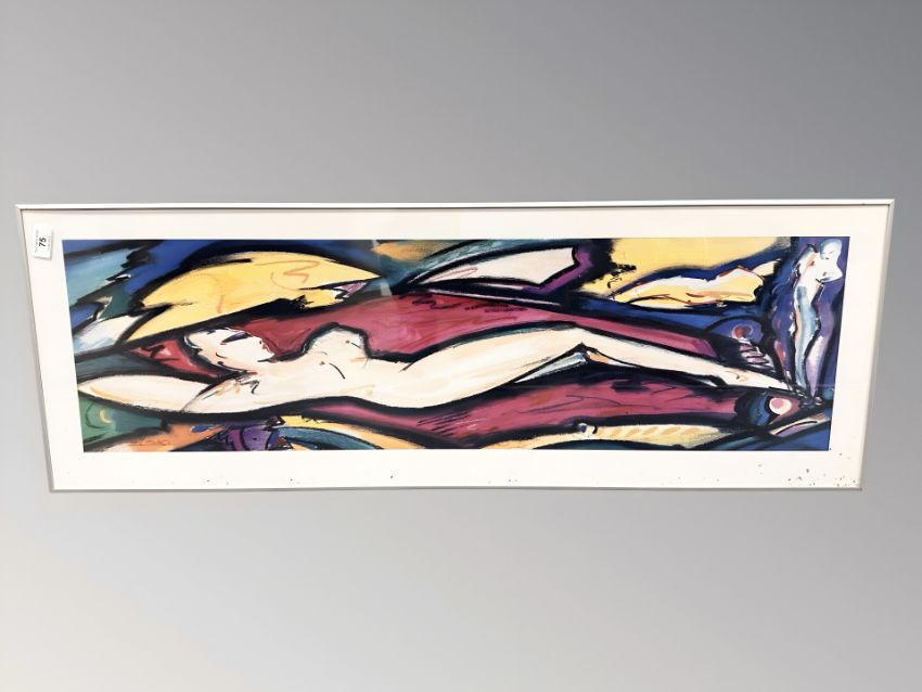 A continental colour print depicting nude figures, 99 cm x 34 cm.