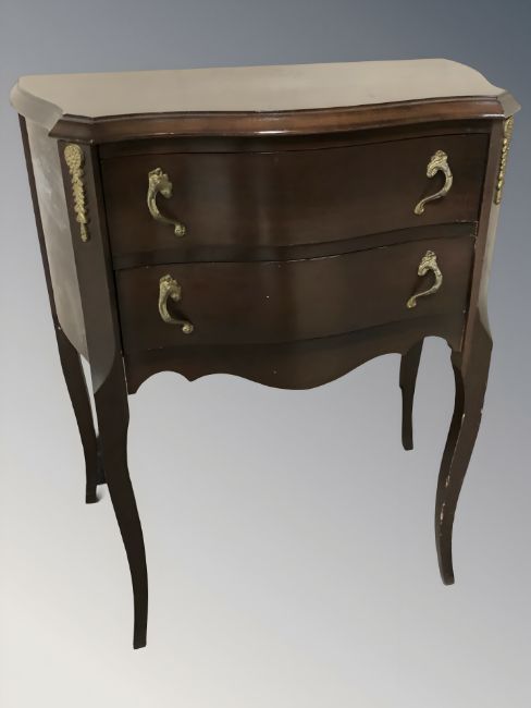 A continental reproduction serpentine front two drawer chest, width 57 cm.