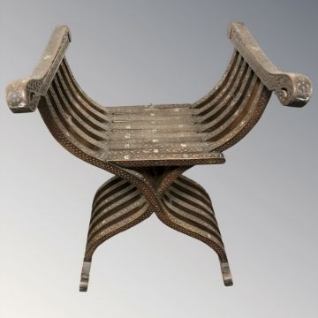 A 19th century Syrian carved hardwood and mother of pearl inlaid savonorala, width 61 cm. (lacking back rest)