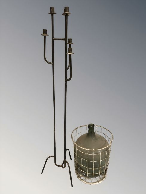 A wrought metal candle stand, height 140 cm, and a glass carboy in metal container.