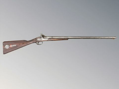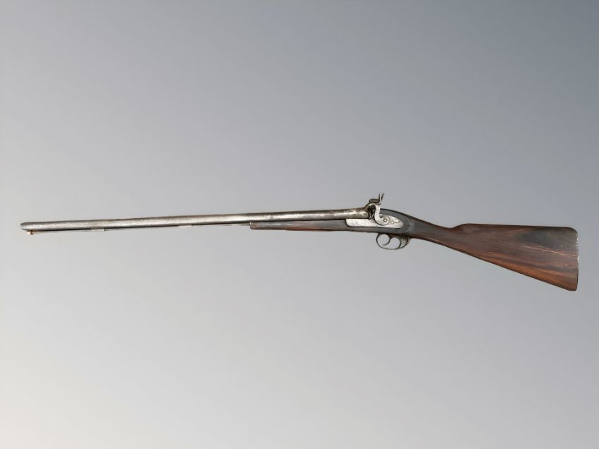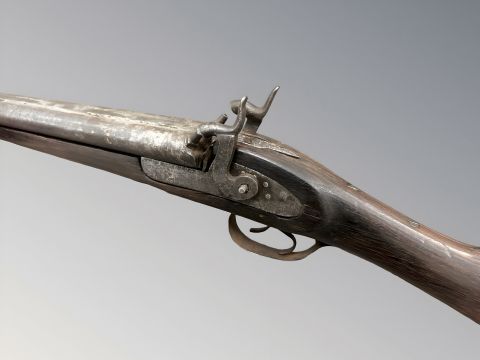 Splits to stock. Barrels detached from breach. Action not working. Metalwork pitted throughout.